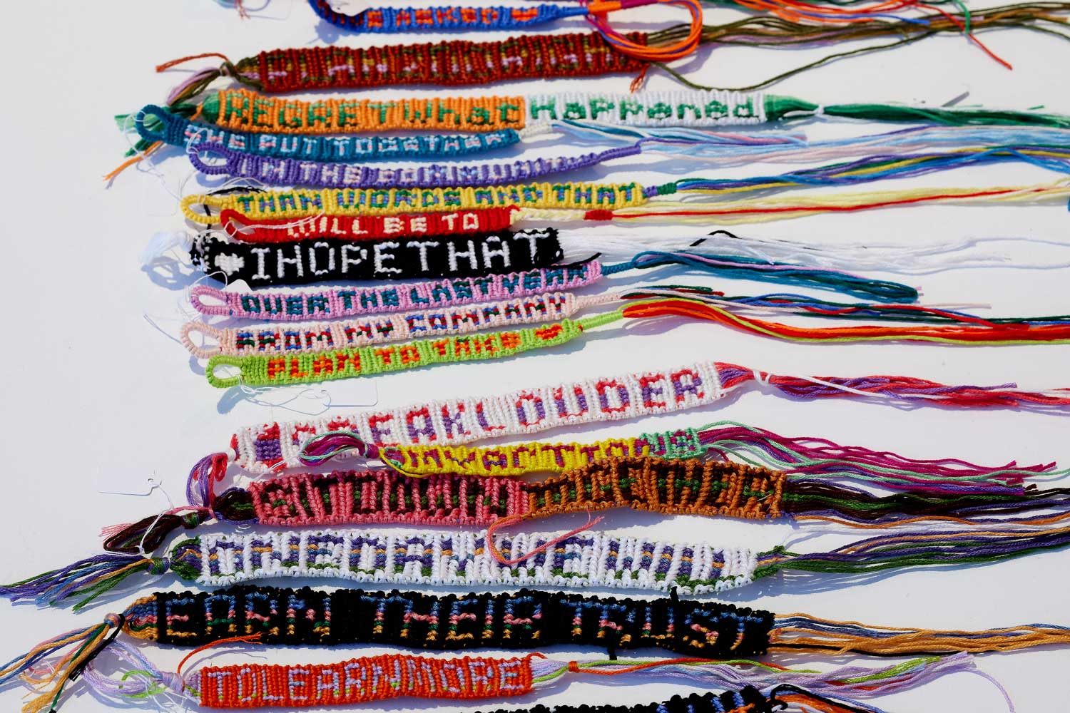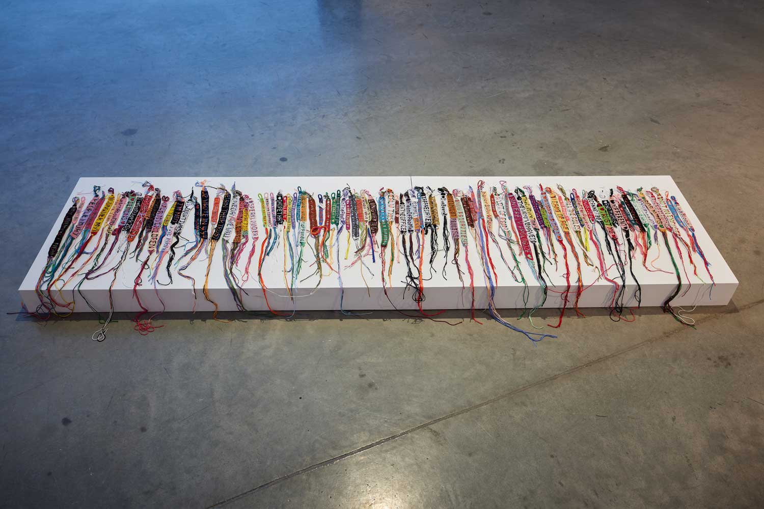 Woven across these 118 friendship bracelets are Harvey Weinstein’s words of apology, the work alludes to the importance of conversations, or information sharing between women. The obsessive nature of the knotting in these bracelets functions as a testament to the event, but also places the trauma at a remove, through making them as a therapeutic act.