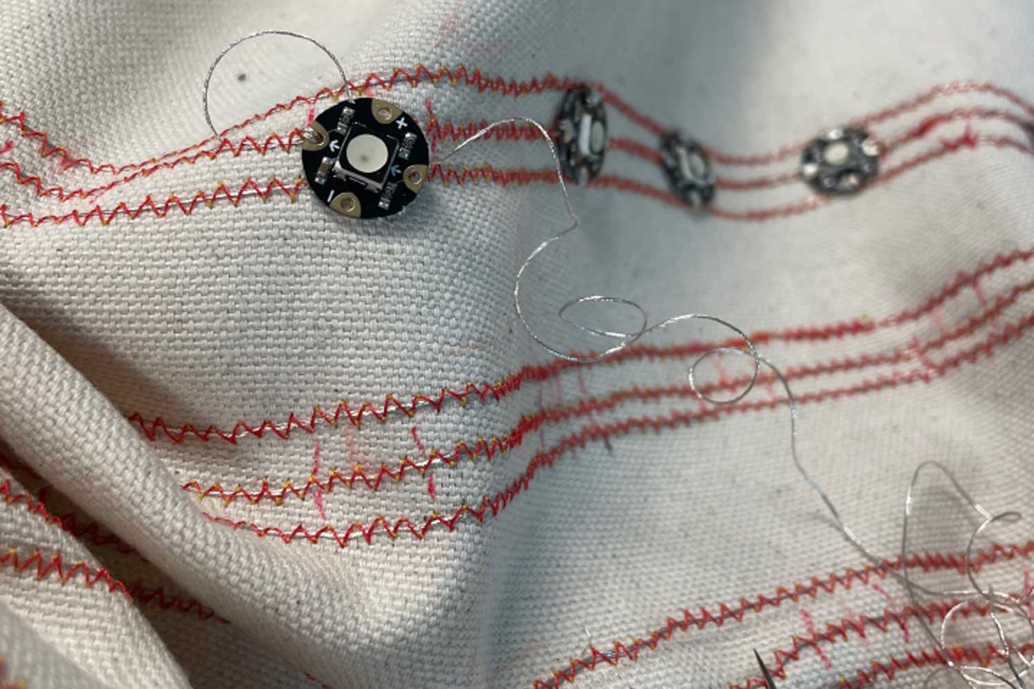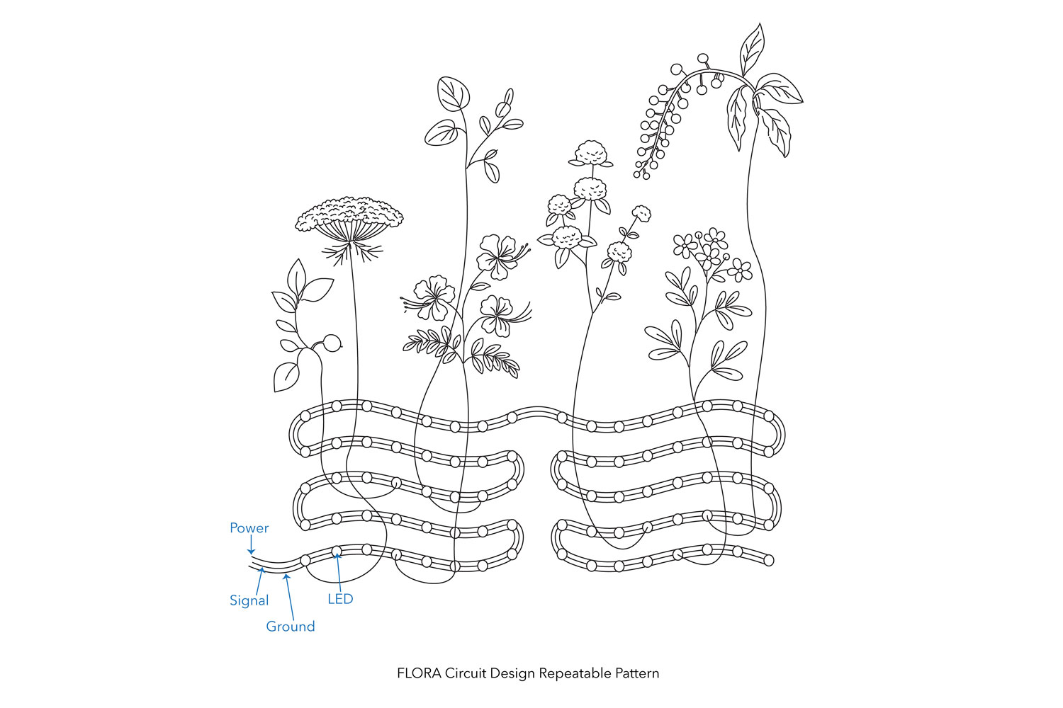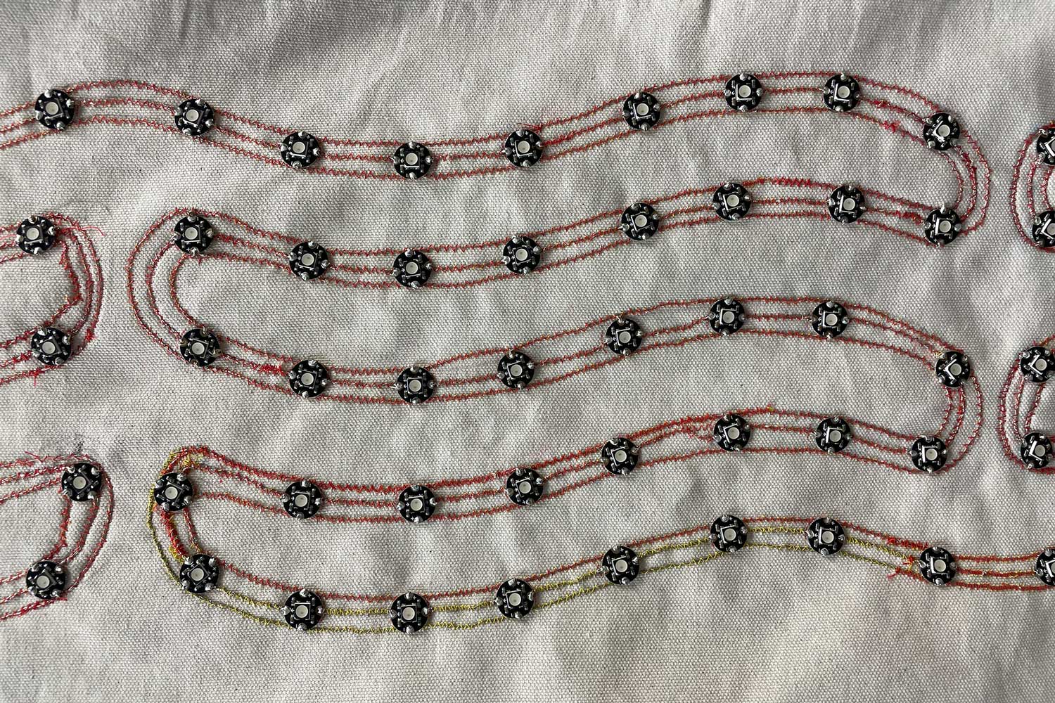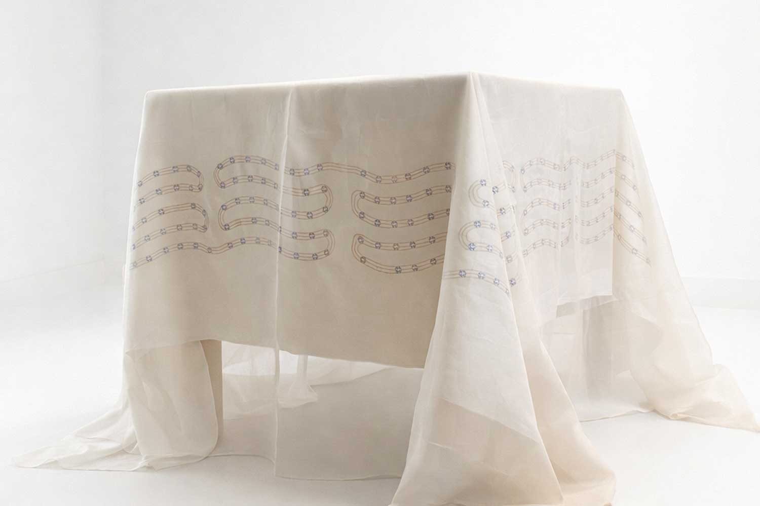 FLORA (Feminist Ledger of Reproductive Access) is a decorative tablecloth patterned with flowers and plants historically used in reproductive health, both as contraceptives and abortifacients. Along its edges, hundreds of hand-embroidered LEDs form a flexible display that presents continuously updated, current legislative data on reproductive rights, with the scrolling text distorted by the fabric’s draping folds.
