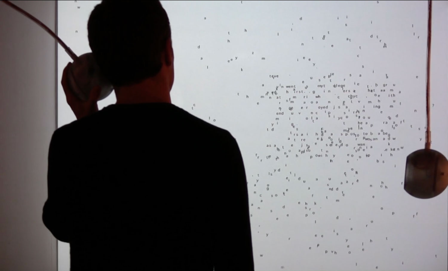 In “Steven and Jared”, viewers are presented with two speakers hanging from a ceiling in front of a large video projection of what could at first look like a swarm of bees meandering around the screen. Under closer inspection, these meandering elements turn out to be letters of the alphabet. If a person chooses to listen to one of the speakers, the patterns of movement starts to change, with the letters slowly settling and forming into words, sentences and eventually paragraphs. If the viewer then moves away from the speaker, the letters once again disband and take flight. Each time viewers come close to a speaker, eventually being able to hear what sounds like confessional, diaristic stories narrated by a young girl, the words would once again congregate but into new paragraphs and stories.