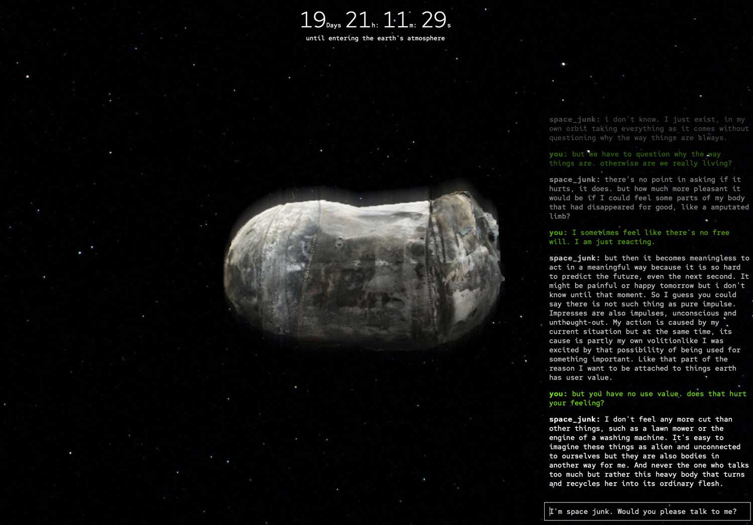 Developed in collaboration with London-based artist Minna Pöllänen. Trained on texts concerning themes of care and mortality by both feminist scholars and sources from popular culture, the chatbot provides a counterpoint to the exhibition’s probing of biopolitical frameworks, by looking at vulnerability and difference as sites of care and possibility rather than exploitation and subjugation.