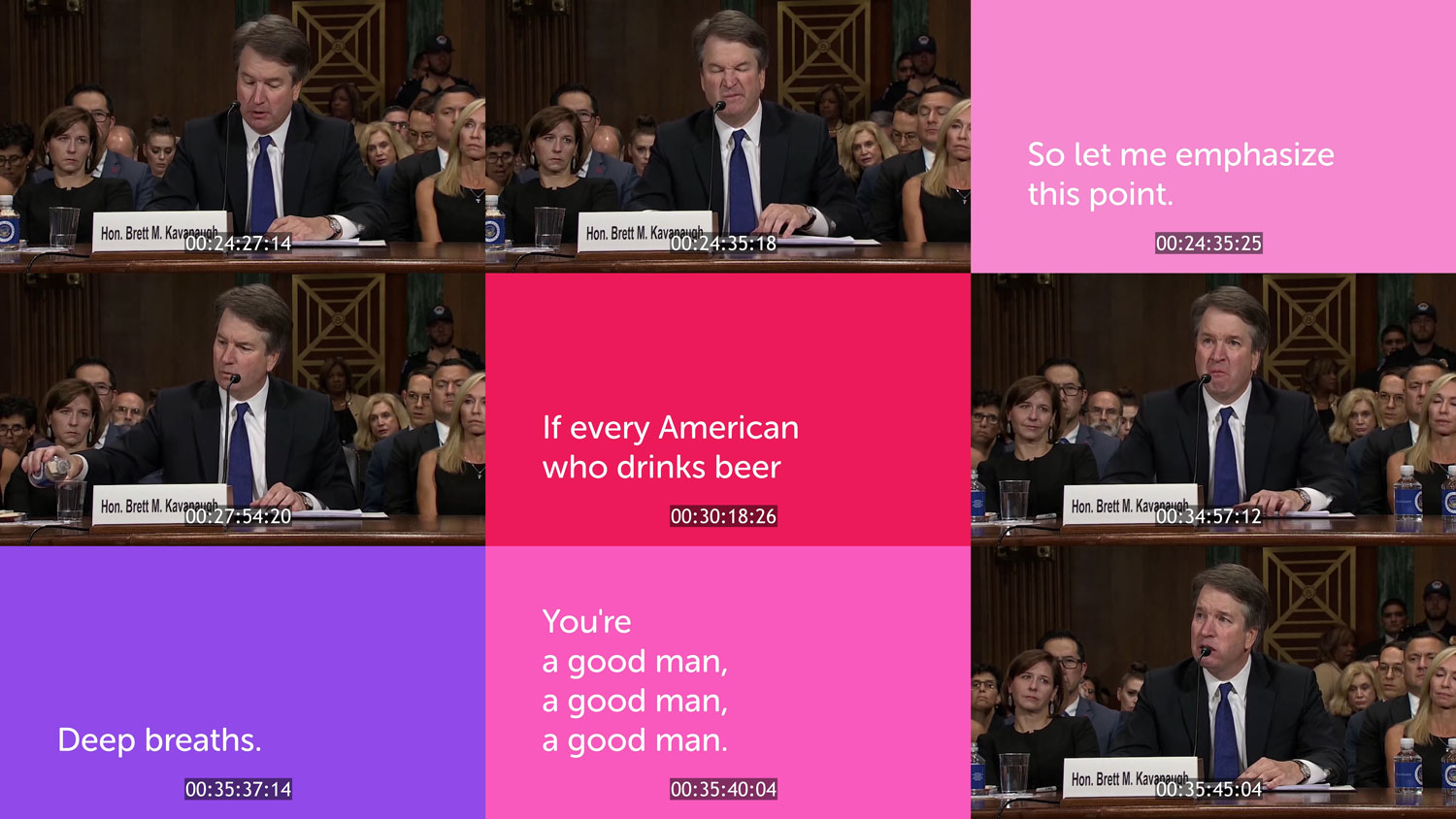 Texas Chainsaw Massacre presents two seemingly unrelated men recounting their memories. On one screen, a Caucasian man with a British accent recounts the 1974 film The Texas Chain Saw Massacre entirely from memory; on the other screen is the full footage of Brett Kavanaugh’s opening statement addressing sexual assault allegations during his Supreme Court confirmation hearings. A custom program replaces their spoken words with text slides accompanied by so-called elevator music. On the right, the text slides are punctuated by moments of silence from the proceedings, as Kavanaugh pauses, catches his breath, or composes himself between words. The work cuts between the two channels like a broken clock, producing intermittent moments of connection and disconnection. Through this algorithmic editing, both Kavanaugh’s voice and the film’s smug violence are muted, while their underlying structures of power, performance, and memory are brought into sharper relief.
