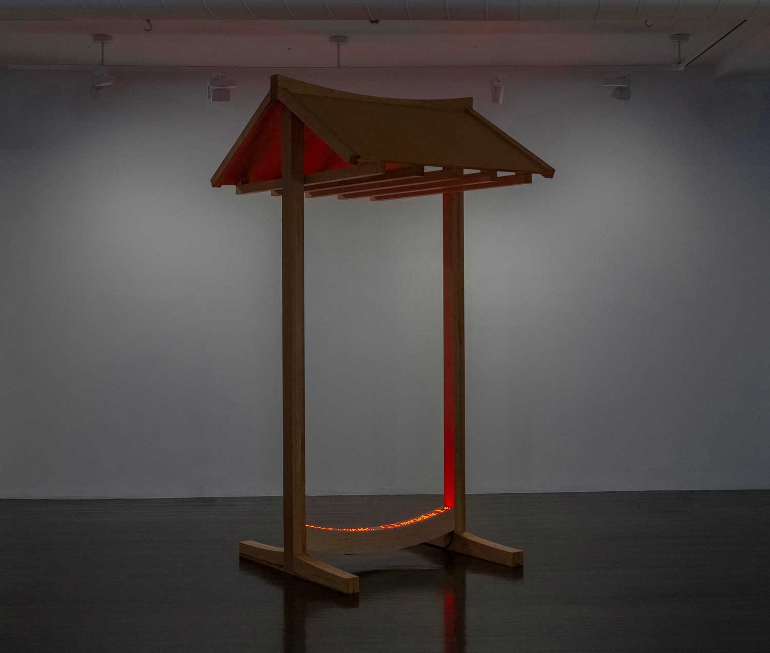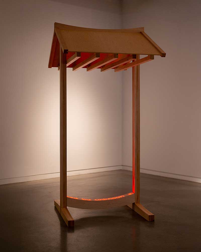 The sculpture references a traditional Korean Hanok, with its raised curving threshold that carries the symbolic meaning of delineating domestic and public spaces, as well as the male and female quarters within a house, and even life and death. The LED signage embedded in the threshold displays continuously scrolling text from a leaked US government spreadsheet from 2017- 2019 (source: American Bridge), with detailed notes of undocumented pregnant minors in their custody, including how far along they were in their pregnancy and whether they wanted an abortion. This was reportedly used to identify and discourage the minors from having an abortion.