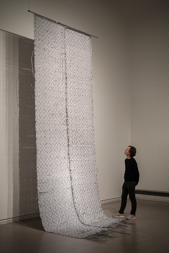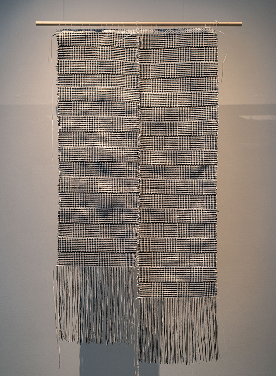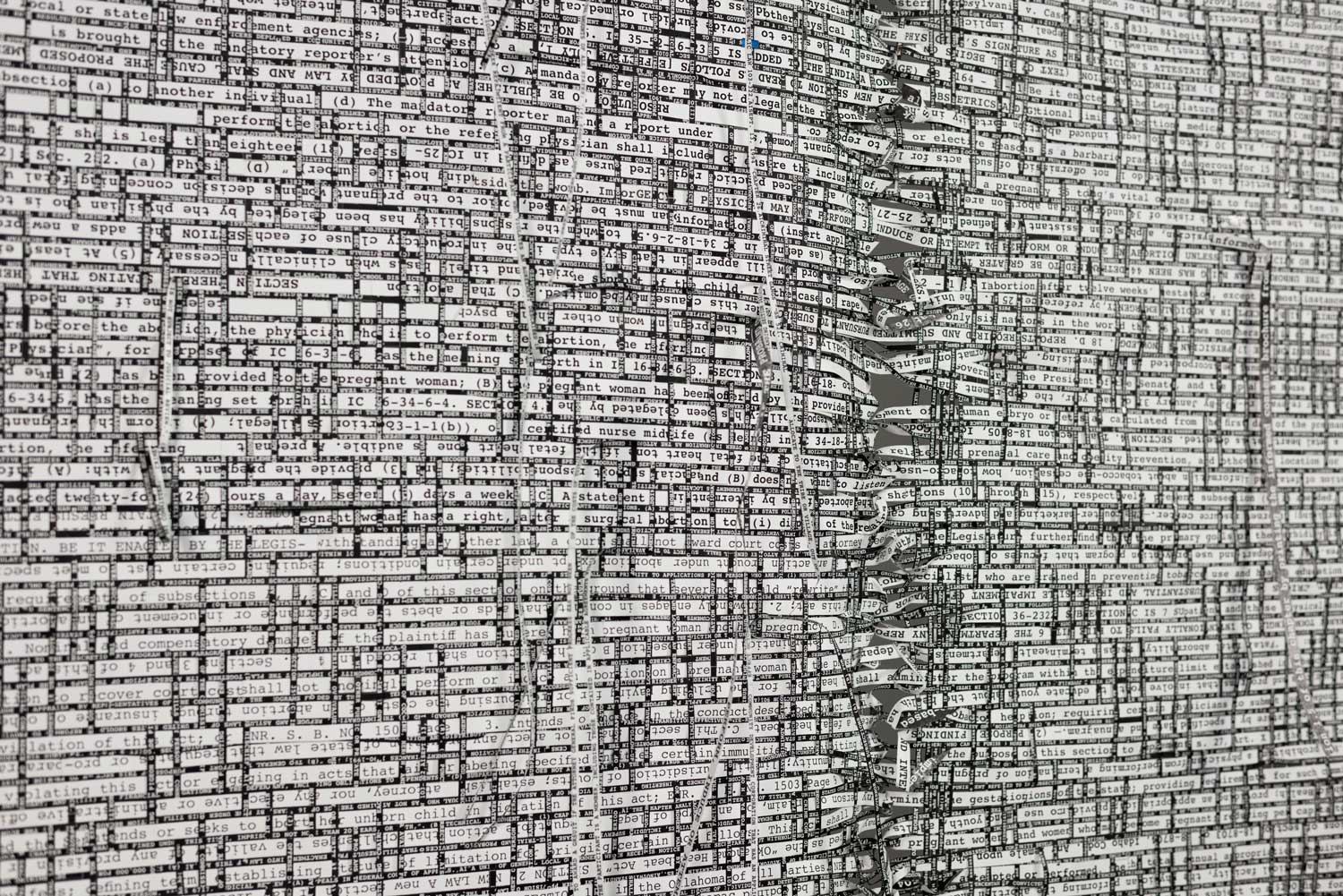 Warp and Weft is an ongoing project involving a series of hand-woven tapestries constructed from paper printouts of legal documents (from state codes concerning abortion, and anti-immigration memoranda to Supreme Court opinions from the last decade, which have steadily gutted the Voting Rights Act of 1965.) Accompanying the tapestry is a photographic series in which I sleep, meditate, read and poop while wearing the fabric in various ways.