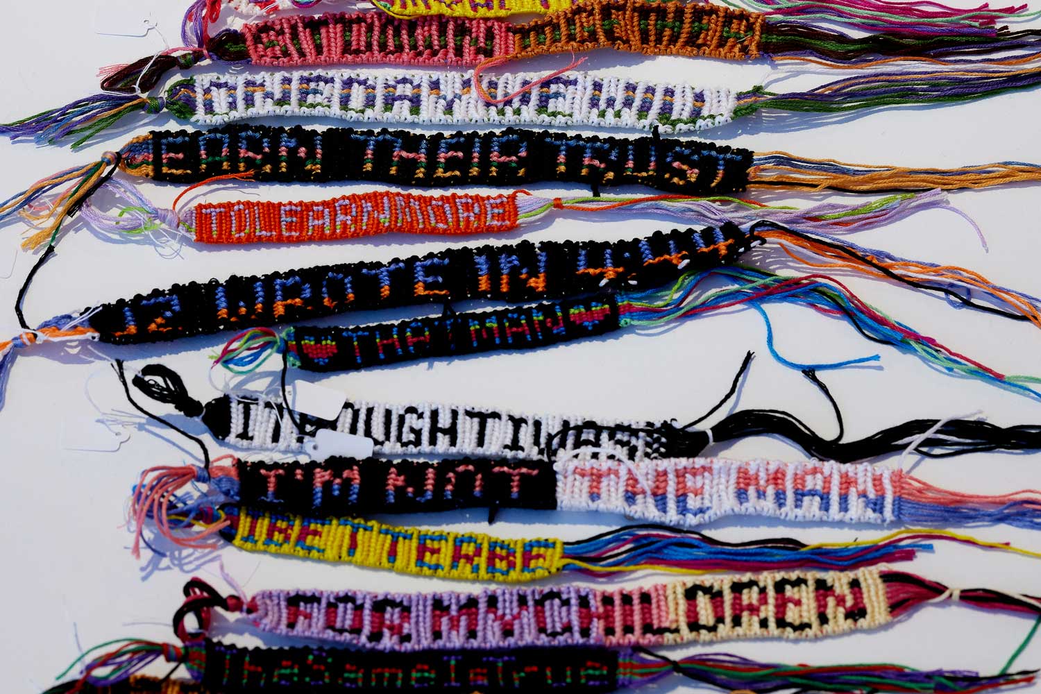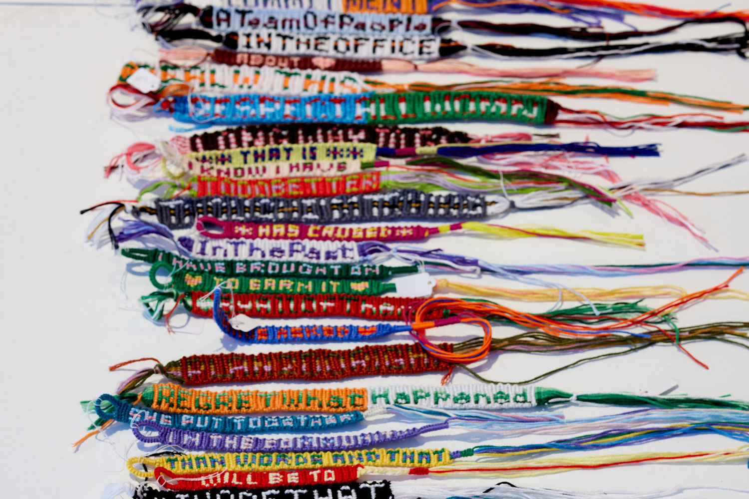 Woven across these 118 friendship bracelets are Harvey Weinstein’s words of apology, the work alludes to the importance of conversations, or information sharing between women. The obsessive nature of the knotting in these bracelets functions as a testament to the event, but also places the trauma at a remove, through making them as a therapeutic act.