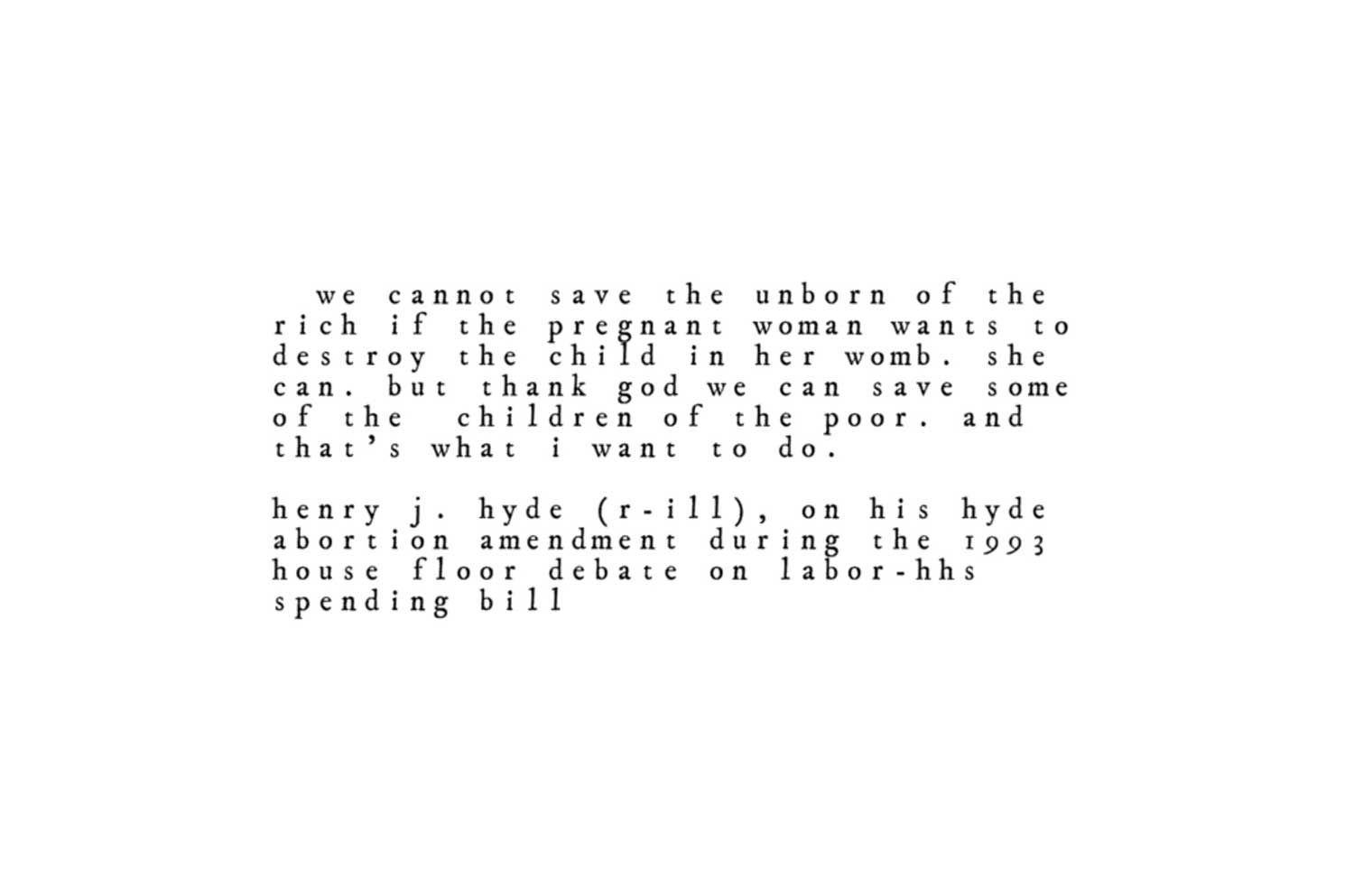 In Bamboo Forest, the letters comprising Henry J. Hyde’s remarks at the 1993 congressional debate, which unwittingly revealed the intersections of women’s reproductive rights with blatant class discrimination. These letters continually disassemble and reassemble to form a series of short texts featuring premodern superstitious beliefs and recipes for contraception and abortion, collected from historical and scholarly texts.