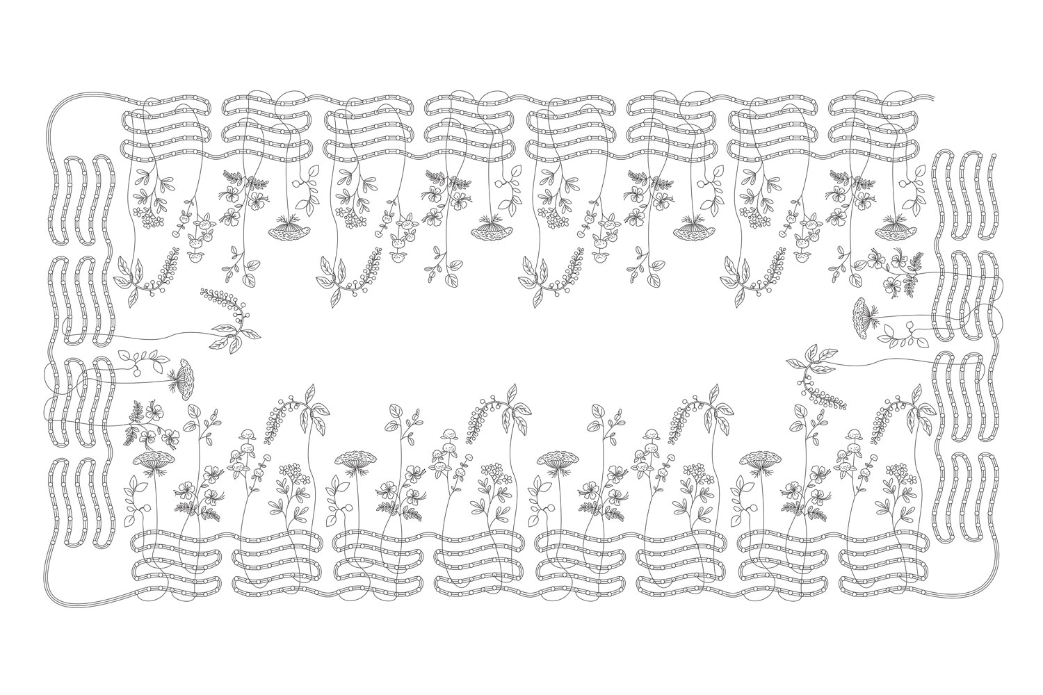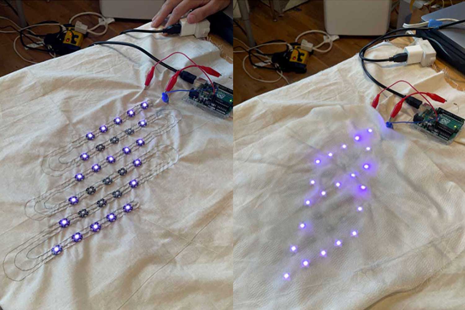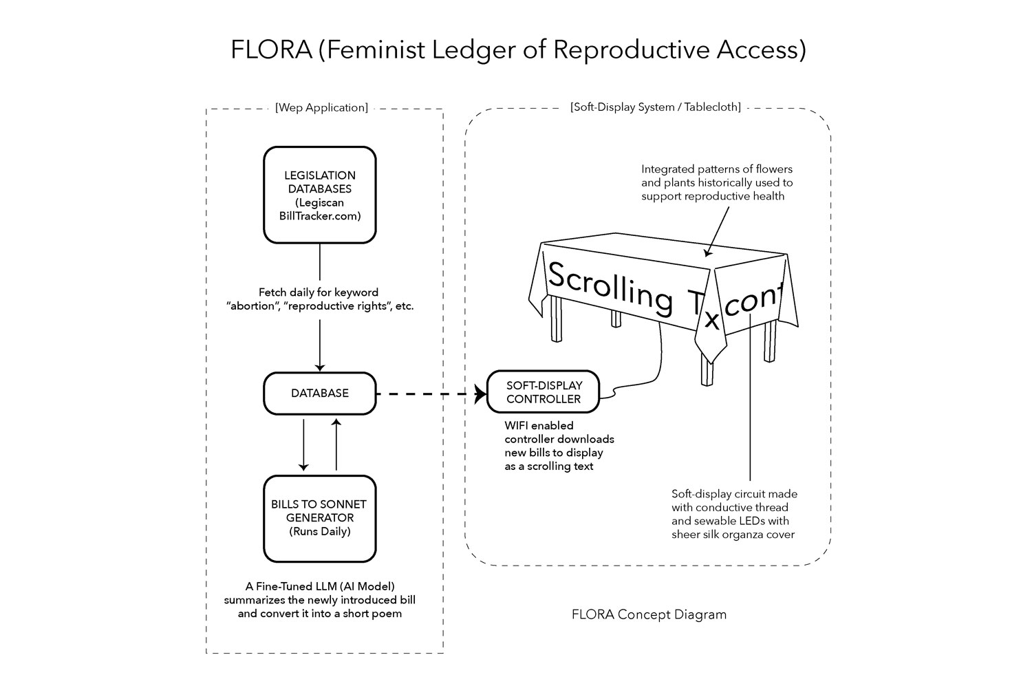 FLORA (Feminist Ledger of Reproductive Access) is a decorative tablecloth patterned with flowers and plants historically used in reproductive health, both as contraceptives and abortifacients. Along its edges, hundreds of hand-embroidered LEDs form a flexible display that presents continuously updated, current legislative data on reproductive rights, with the scrolling text distorted by the fabric’s draping folds.