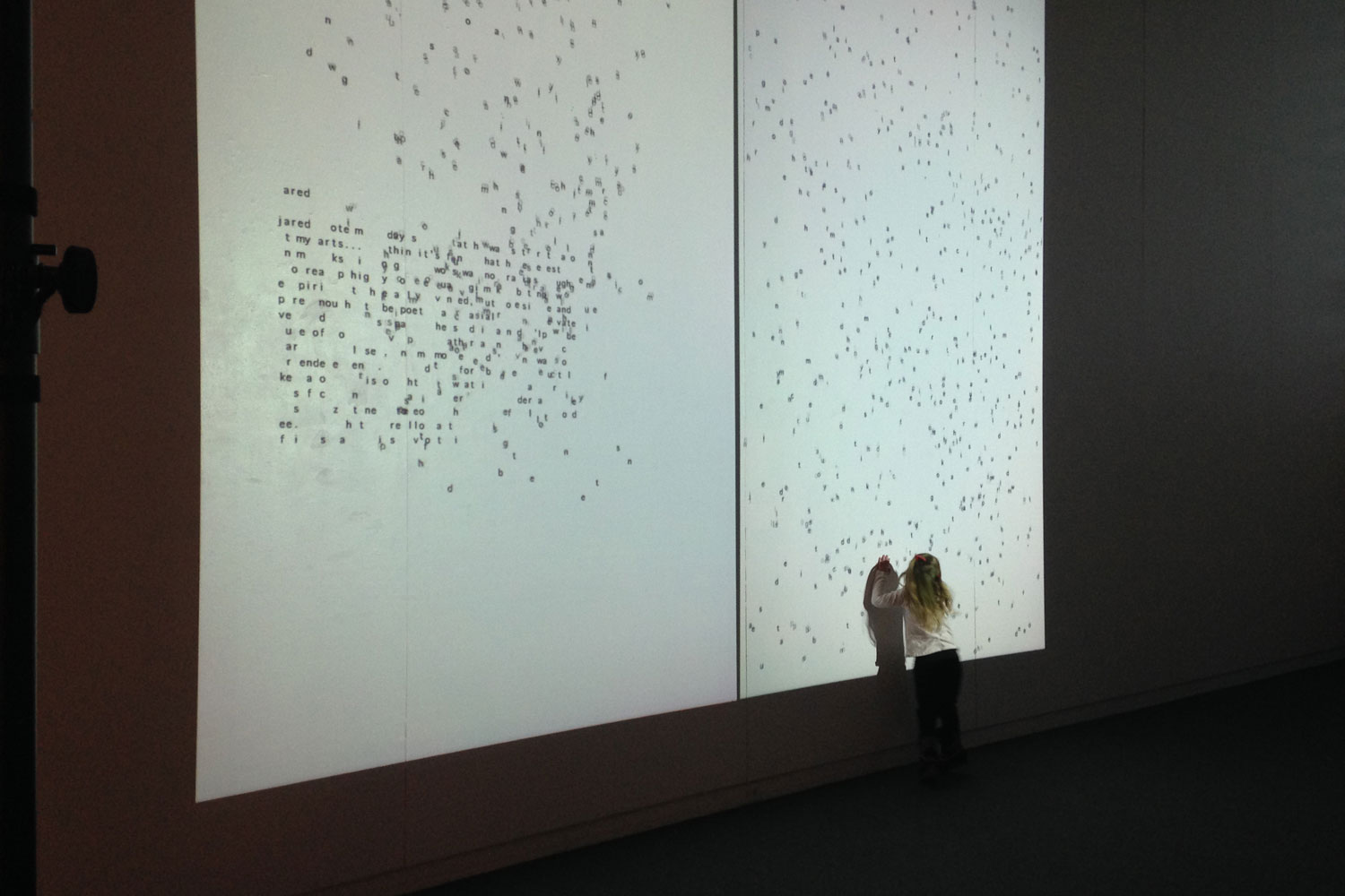 In “Steven and Jared”, viewers are presented with two speakers hanging from a ceiling in front of a large video projection of what could at first look like a swarm of bees meandering around the screen. Under closer inspection, these meandering elements turn out to be letters of the alphabet. If a person chooses to listen to one of the speakers, the patterns of movement starts to change, with the letters slowly settling and forming into words, sentences and eventually paragraphs. If the viewer then moves away from the speaker, the letters once again disband and take flight. Each time viewers come close to a speaker, eventually being able to hear what sounds like confessional, diaristic stories narrated by a young girl, the words would once again congregate but into new paragraphs and stories.