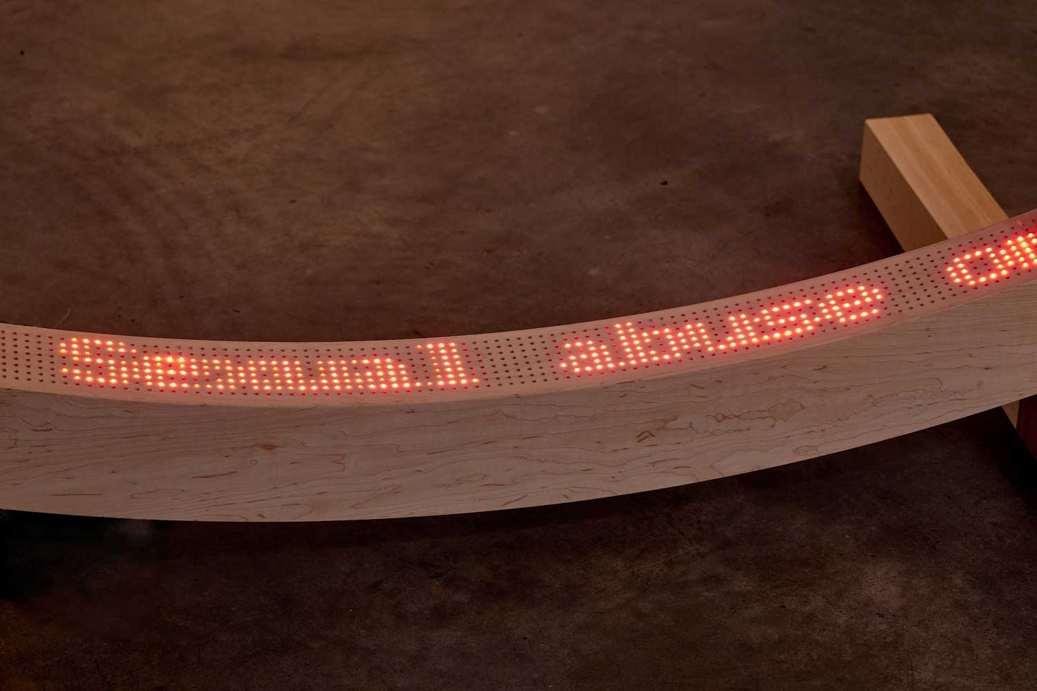 The sculpture references a traditional Korean Hanok, with its raised curving threshold that carries the symbolic meaning of delineating domestic and public spaces, as well as the male and female quarters within a house, and even life and death. The LED signage embedded in the threshold displays continuously scrolling text from a leaked US government spreadsheet from 2017- 2019 (source: American Bridge), with detailed notes of undocumented pregnant minors in their custody, including how far along they were in their pregnancy and whether they wanted an abortion. This was reportedly used to identify and discourage the minors from having an abortion.
