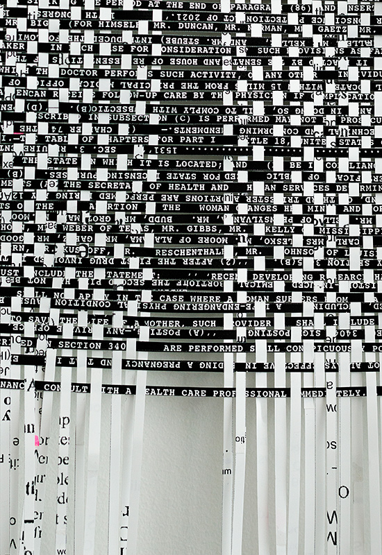 Warp and Weft is an ongoing project involving a series of hand-woven tapestries constructed from paper printouts of legal documents (from state codes concerning abortion, and anti-immigration memoranda to Supreme Court opinions from the last decade, which have steadily gutted the Voting Rights Act of 1965.) Accompanying the tapestry is a photographic series in which I sleep, meditate, read and poop while wearing the fabric in various ways.